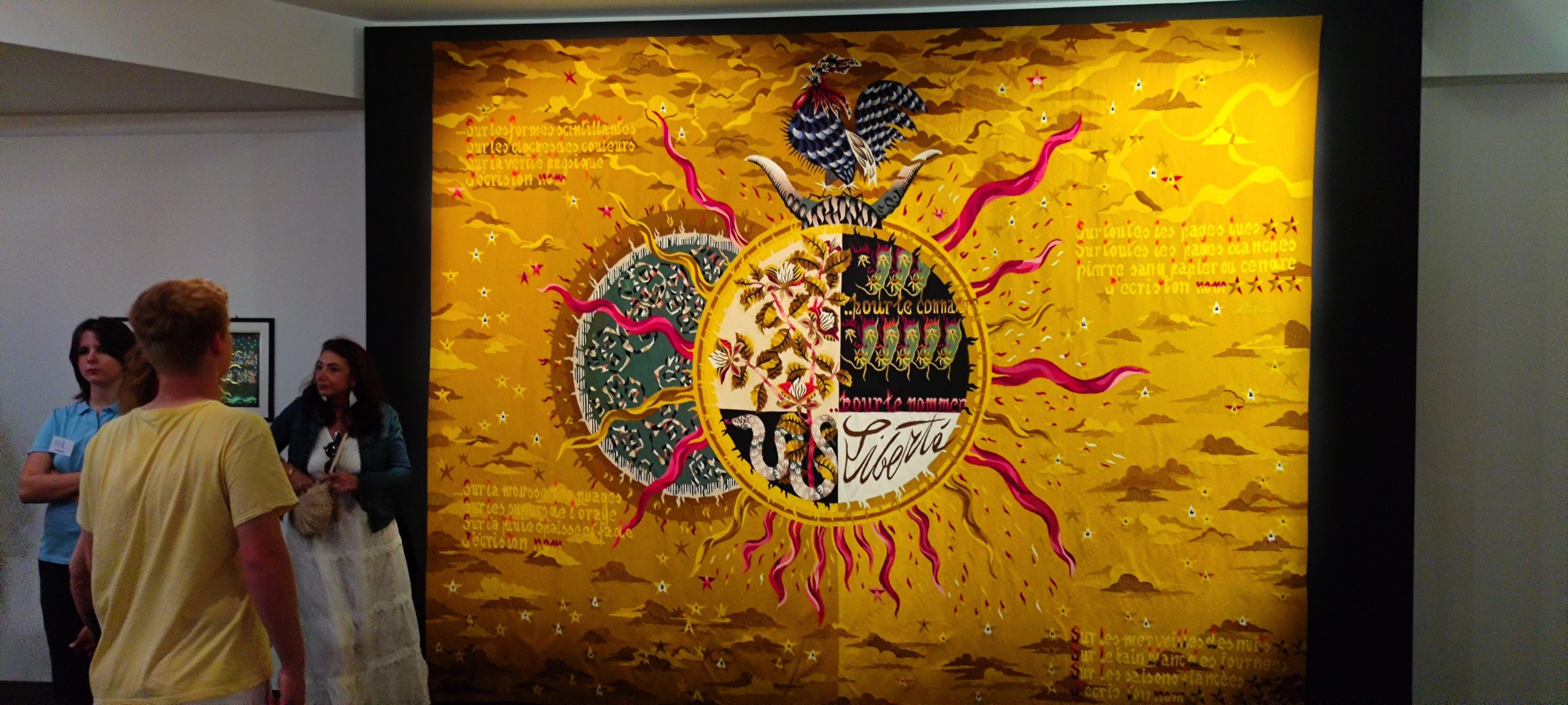L’exposition aborde la céramique d’art, mais pas seulement car Lurçat était un artiste polyvalent, connu pour ses tapisseries, ses peintures et son travail de cartonnier. Une pièce clé qui introduit l’exposition est une tapisserie intitulée « Apollo, les quatre éléments » (terre, feu, eau, air) des années 1960, représentative de son style avec un contraste entre couleurs vives et fond noir, reflétant la vision cosmique et humaniste de Lurçat mais aussi démontrant une certaine inquiétude. Il voyait l’impact des actions humaines sur l’équilibre de l’univers.