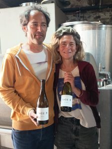 Visite de la cave Face B avec Séverin et Mathilde Barioz pour une dégustation de vins biologiques de Calce, assez difficiles à produire en raison de la dureté du sol.